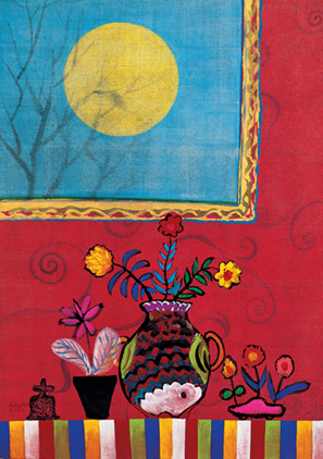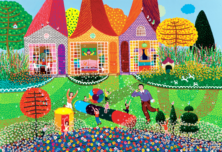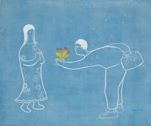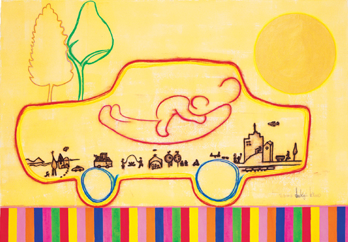 따뜻하게 태양이 빛나는 길을 따라 꽃으로 만든 바퀴를 달고 자동차가 달린다. 차 안에는 엄마와 아빠 그리고 건강한 소년이 함께 드라이브를 즐긴다. 차 지붕은 화사한 꽃 무리가 화환을 이루고 소년의 가족 나들이는 흥겨운 새들의 지저귐과 너울대는 나비의 춤처럼 즐겁다. 작가는 소년을 통해 소년이 꿈꾸고 상상하는 모든 것들에 색을 입힌다. 소년이 사는 세상은 단색조의 흑백이 아닌 온갖 상상과 생활의 즐거움이 살아 넘치는 우주이다.