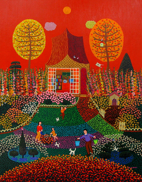 김덕기는 한층 밝고 화려한 원색으로 한없이 투명하고 밝은 가족의 이상적인 풍경을 그린다. <행복한 정원>이나 <아들의 정원> 등 마치 사랑의 부적처럼, 다정한 부부와 어린 자녀들, 그들이 함께 사는 정원 딸린 그림같은 집의 사랑 넘치는 풍경은 그의 그림을 보는 우리들에게까지 그들의 사랑을 전염시킨다.