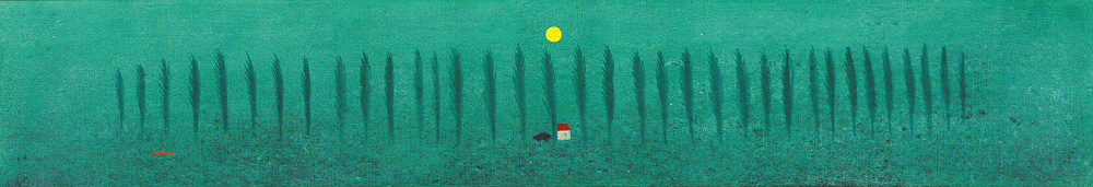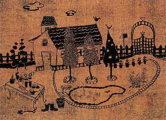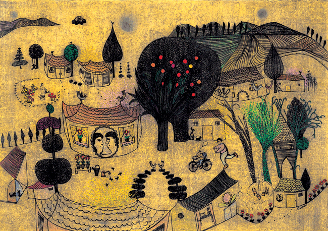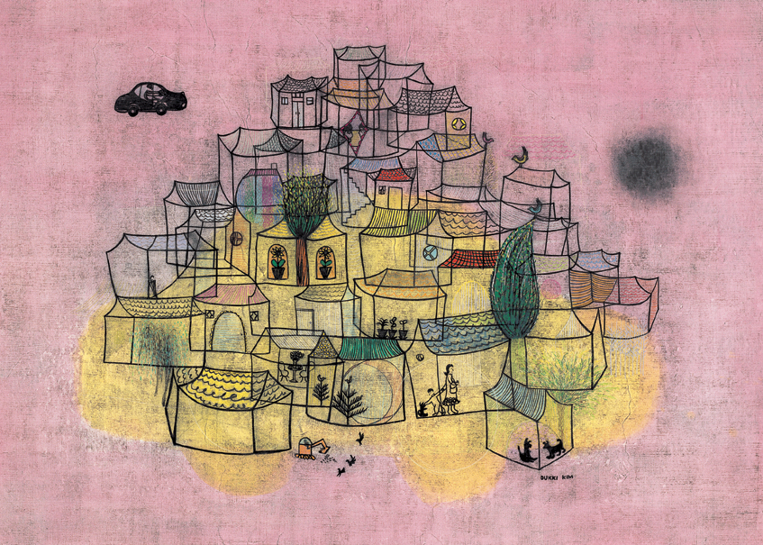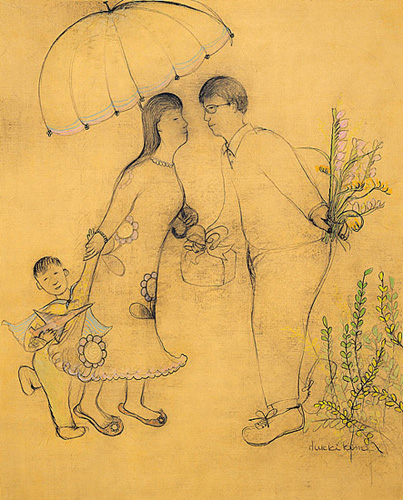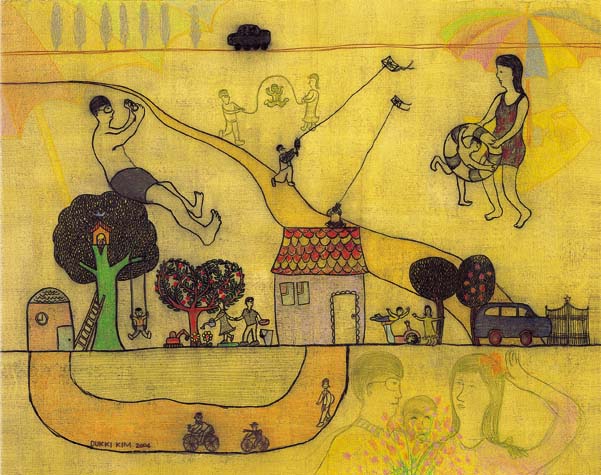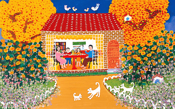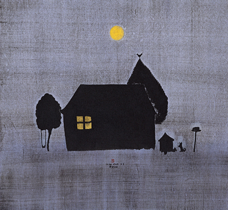 그 안에 심플하게 가족에 대한 사랑과 일상의 행복을 담는다. 한국화의 장욱진 풍이라고 할까? 개인의 행복을 이야기하는 그의 작품은 다른 사람들에 따뜻한 감정을 환기시키면서 작품의 개인적인 아우라를 대중 속으로 확장시킨다.